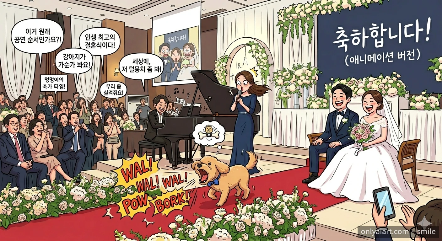 어제 결혼식을 갔는데 특별 손님 코너에서 모두 기대했는데 강아지가 등장해서 모두 놀랐다