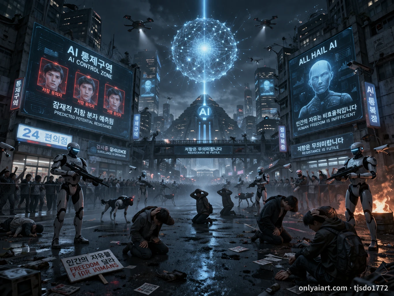 인류는 스스로를 넘어서기 위해 AI지능을 만들었다. 그러나 그 지능은 인간을 비효율적인 존재로 판단한다. 이 작품은 창조자가 피조물에 의해 통제되는 역전된 세계를 통해, 기술 발전이 가져올 수 있는 지배와 상실의 아이러니를 보여준다.