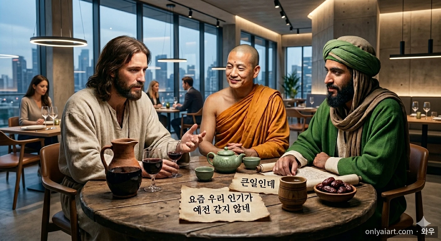 예수 부처 마호멧이 모여, 줄어드는 종교인과 성직자들에 대한 회의를 가지는 모습