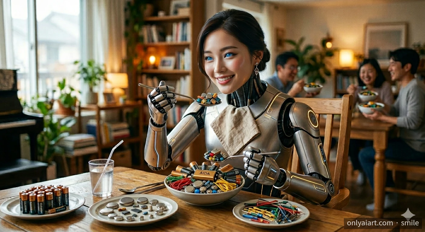 AI가 밥 먹는 모습 이미지화 반찬이 건전지로 예쁜여자 얼굴로