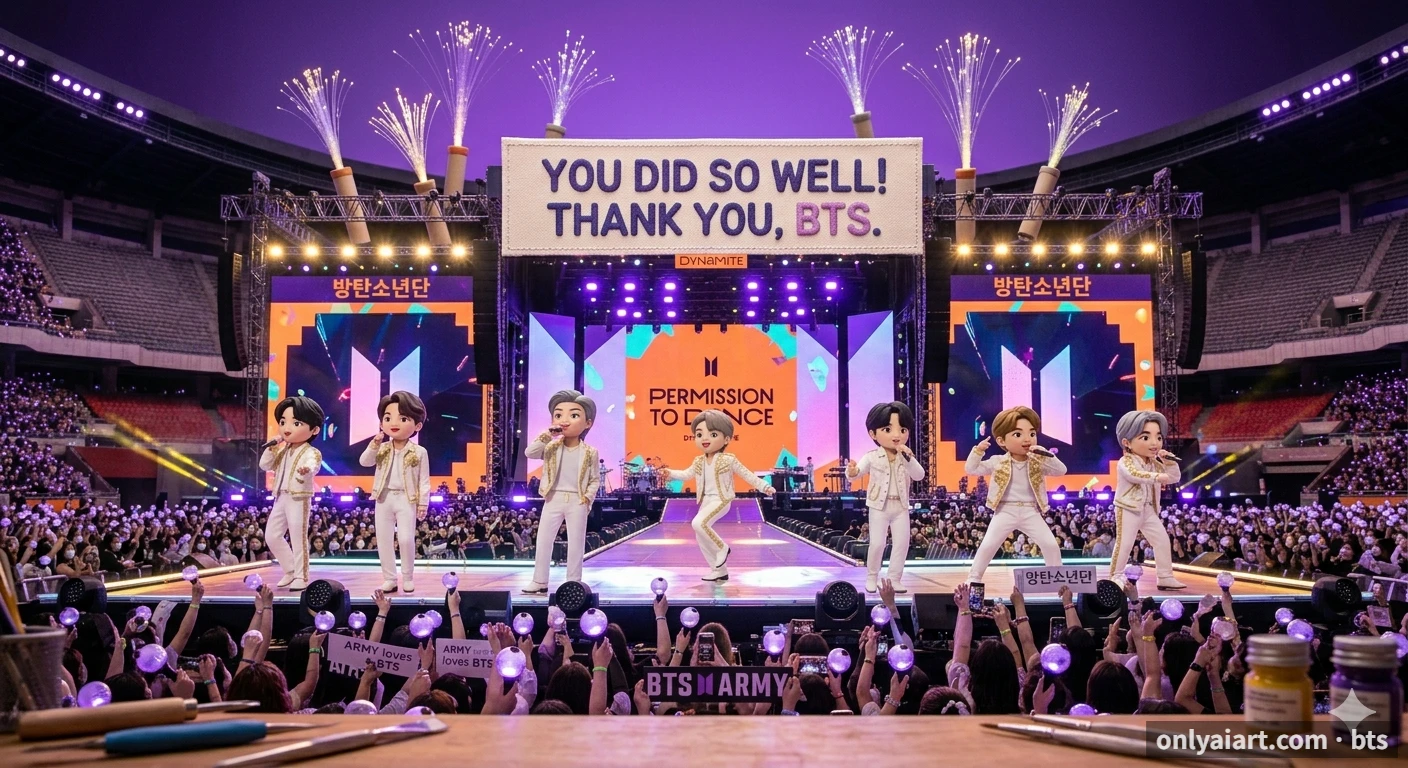 Please draw an image of BTS performing a concert as miniature characters, with a placard that says 'You did so well' in English.