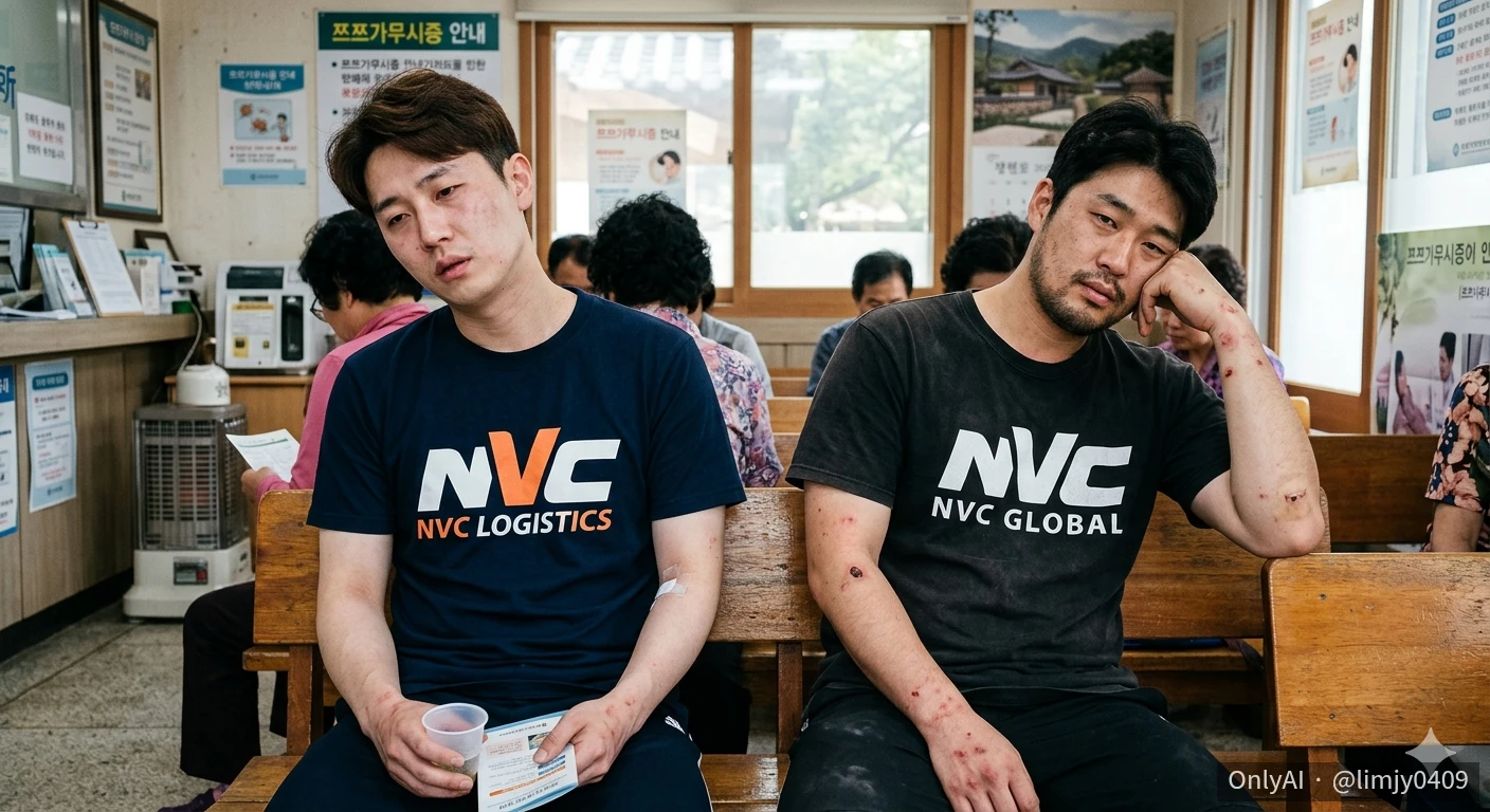 쯔쯔가무시에 걸린 nvc 로고 티셔츠 입은 젊은 30대 남자 2명 이미지