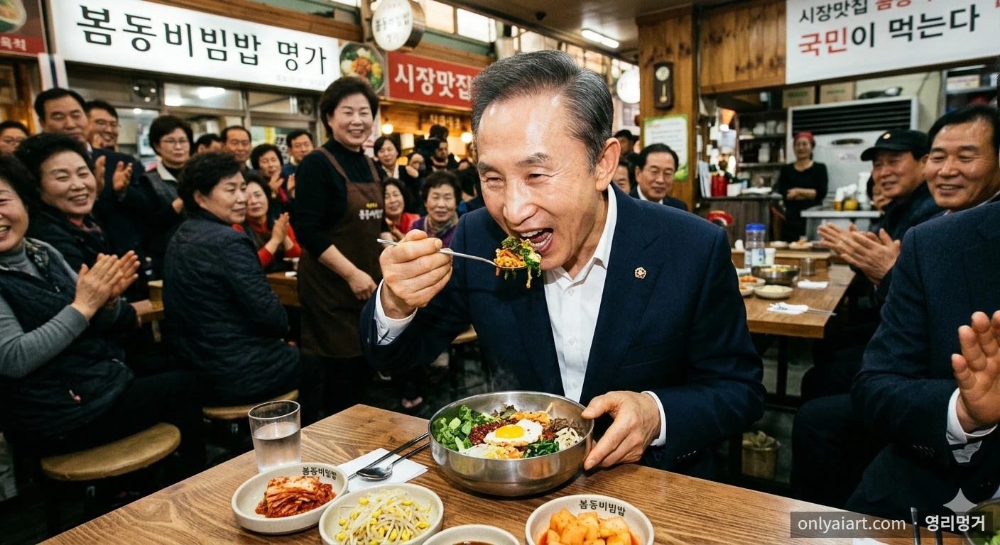 봄동비빔밥 먹는 이명박대통령 이미지를 생성해주되, 대통령 후보시절 국밥 먹방 선거운동 영상이 떠오르도록 만들어줘