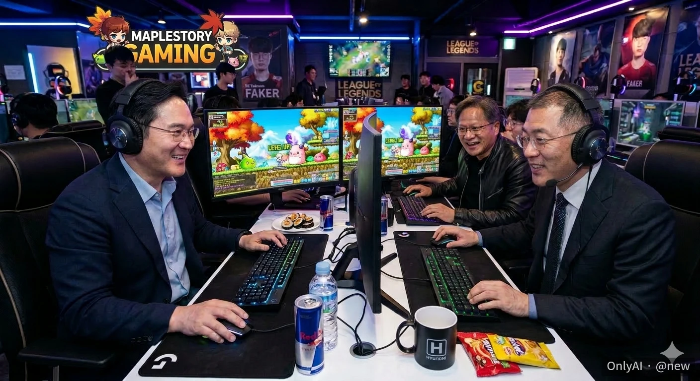 삼성전자 이재용 회장, 현대차 정의선 회장, 엔비디아 젠슨황 회장이 같이 메이플스토리 게임을 하는 사진을 만들어 주세요